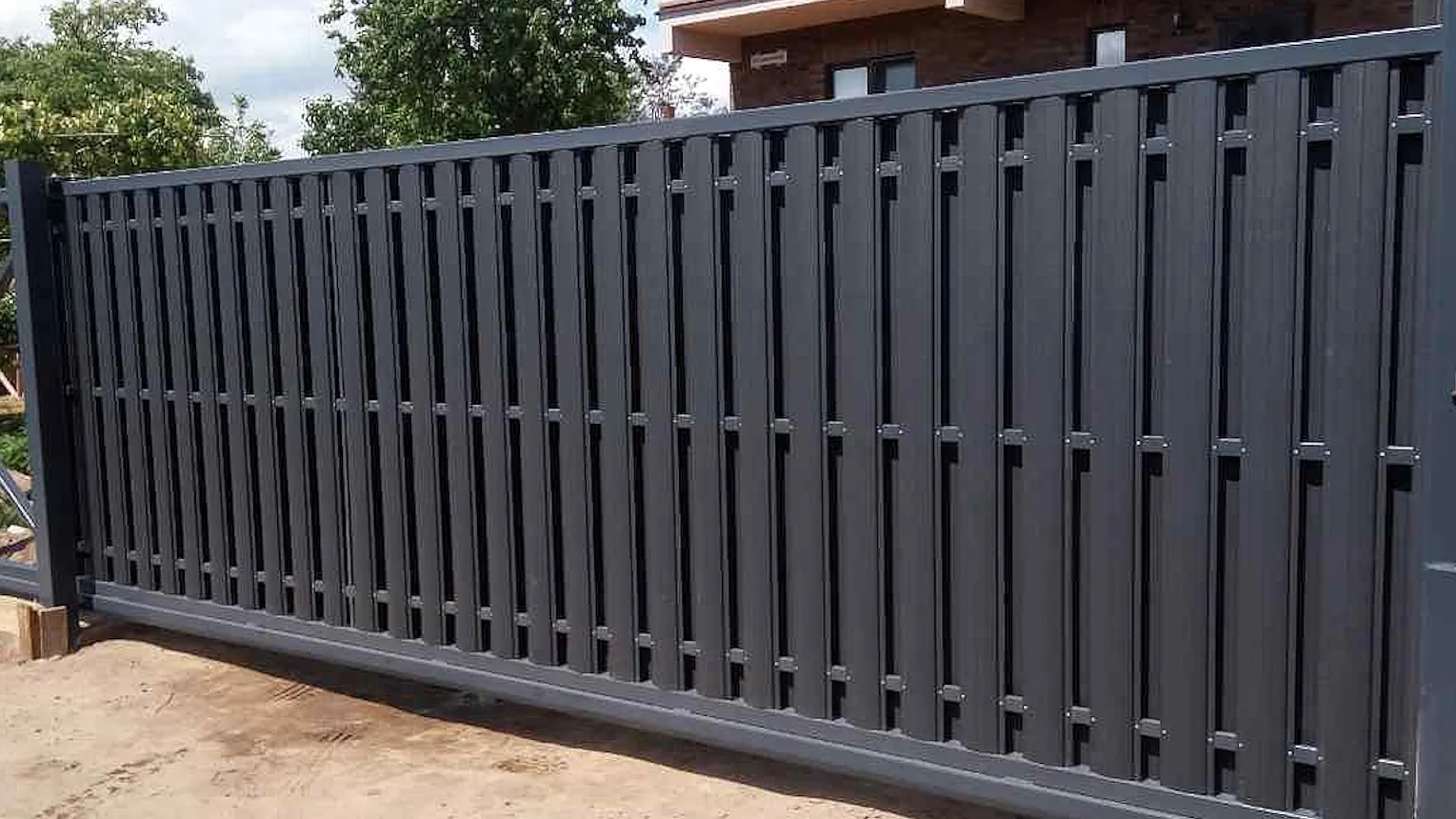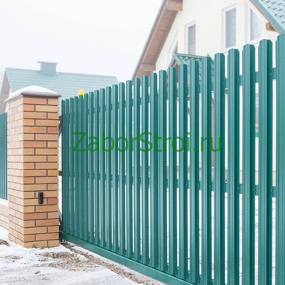 Откатные ворота из евроштакетника с встроенной калиткой и автоматикой